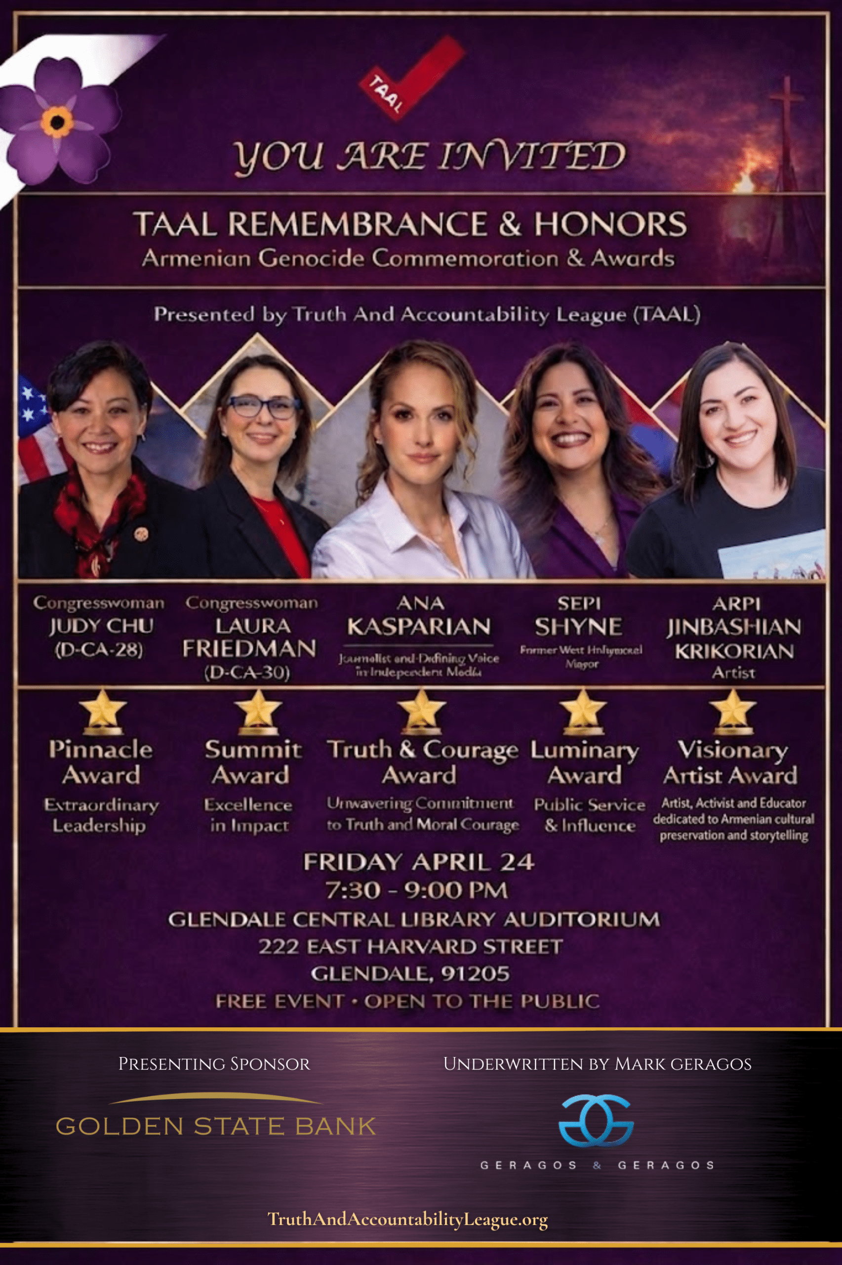 Congresswomen Judy Chu, Laura Friedman, and Journalist Ana Kasparian to Be Honored at Armenian Genocide Commemoration in Glendale Library