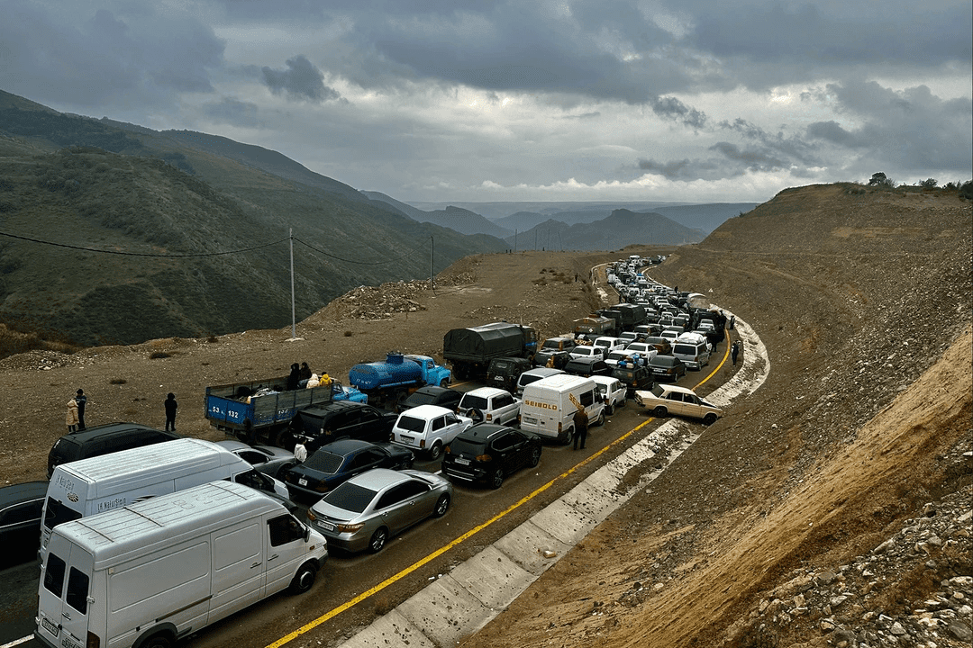 Cars at a standstill on the Lachin Corridor, as the Armenian population of Nagorno-Karabakh flees to Armenia in 2023. Photo: Marut Vanyan/OC Media.