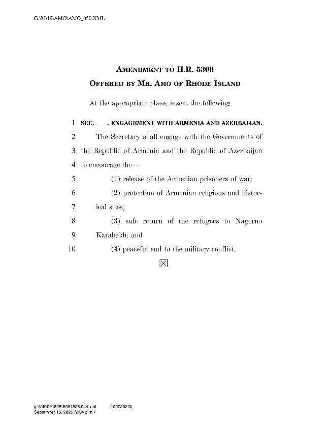 The amendment read in part: “The Secretary [of State] shall engage with” the Government of Azerbaijan “to encourage the (1) release of the Armenian prisoners of war; (2) protection of Armenian religious and historical sites; (3) safe return of the refugees of Nagorno-Karabakh; and (4) peaceful end to the military conflict.”