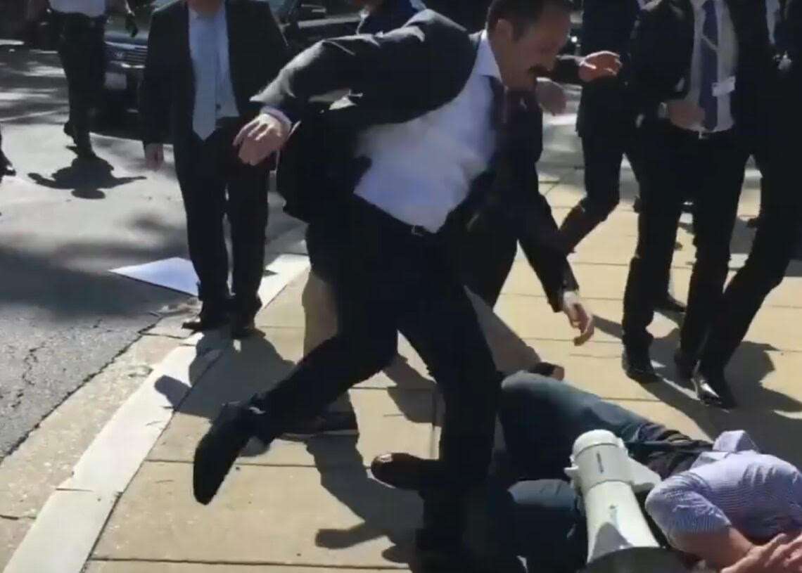 The attack unfolded shortly after Erdogan’s official meeting with then-president Donald Trump at the White House. Kurdish and anti-Erdogan activists gathered peacefully on a sidewalk opposite the Turkish ambassador’s residence.